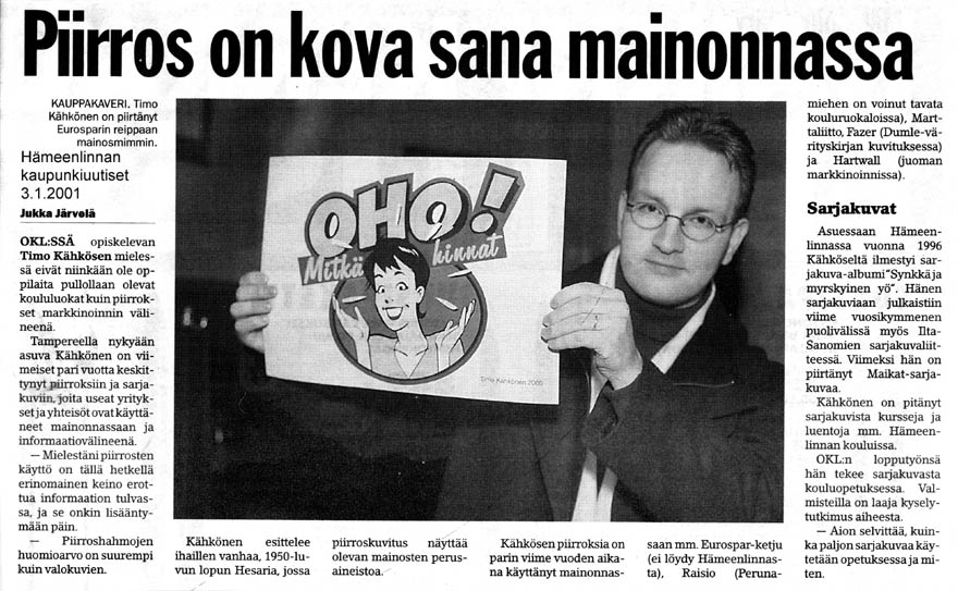 Hämeenlinnan kaupunkiuutiset julkaisi sarjakuvataiteilija Timo Kähkösen haastattelun "Piirros on kova sana mainonnassa" (tekstinä / näköispainoksena). |