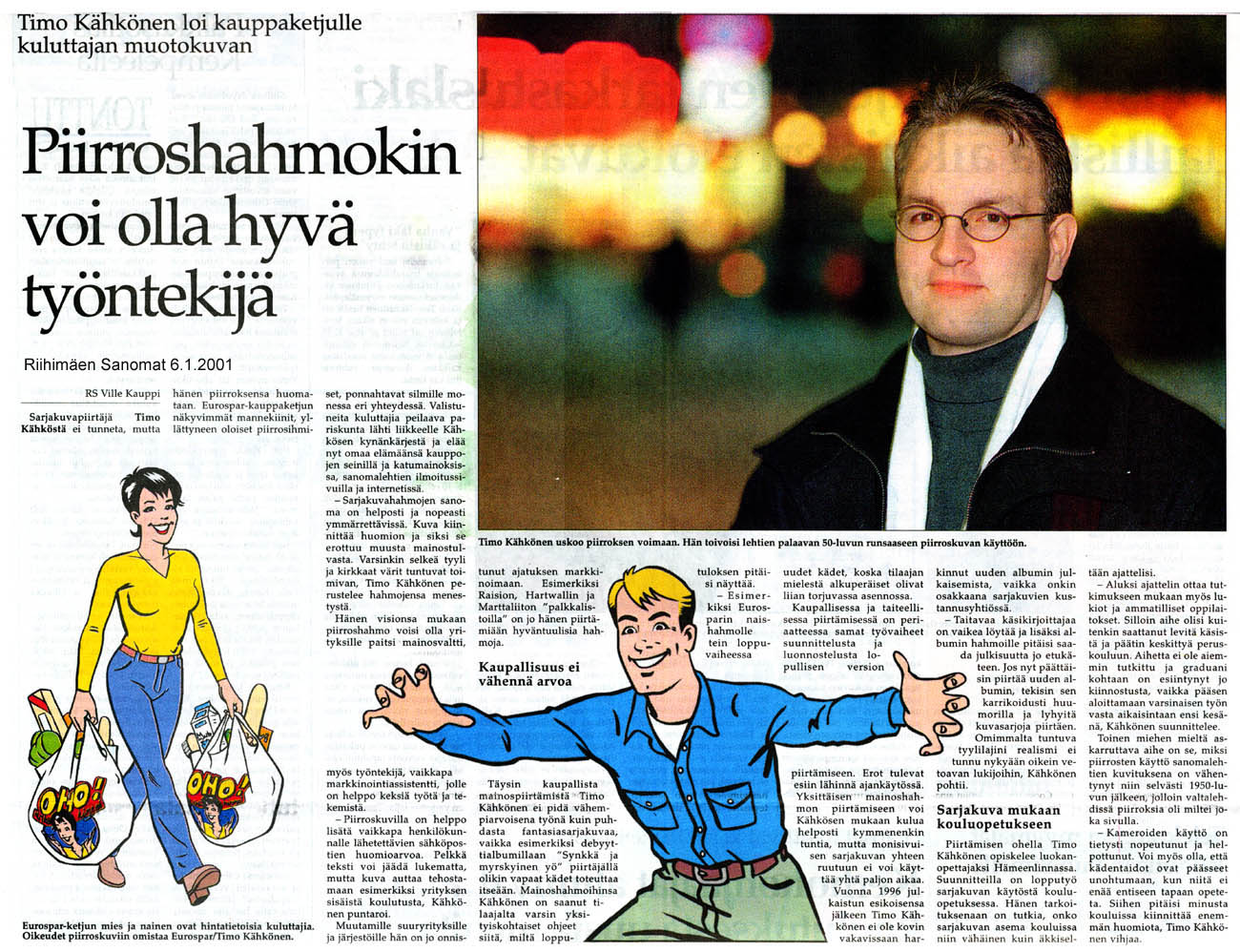 Riihimäen Sanomat julkaisi sarjakuvataiteilija Timo Kähkösen haastattelun "Piirroshahmokin voi olla hyvä työntekijä" (tekstinä / näköispainoksena). Aiheena olivat Kähkösen piirtämät Eurospar-piirroshahmot. |